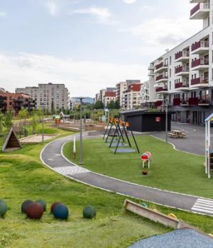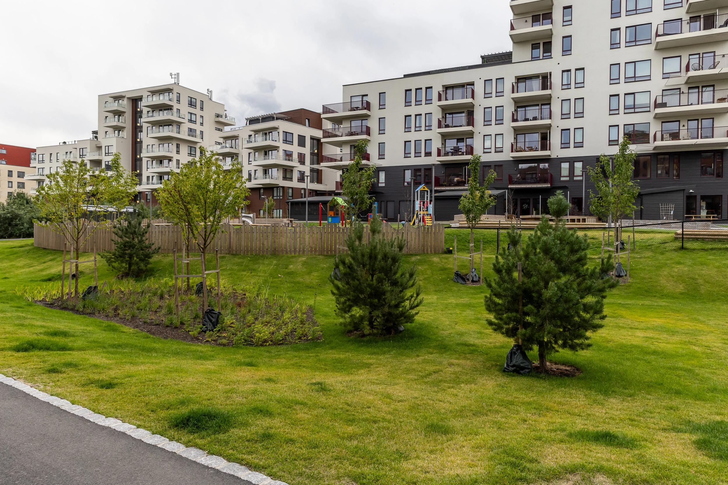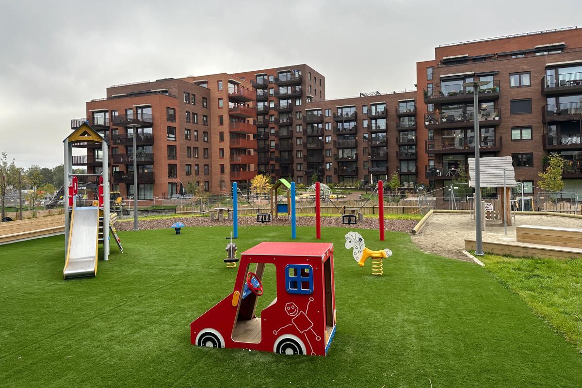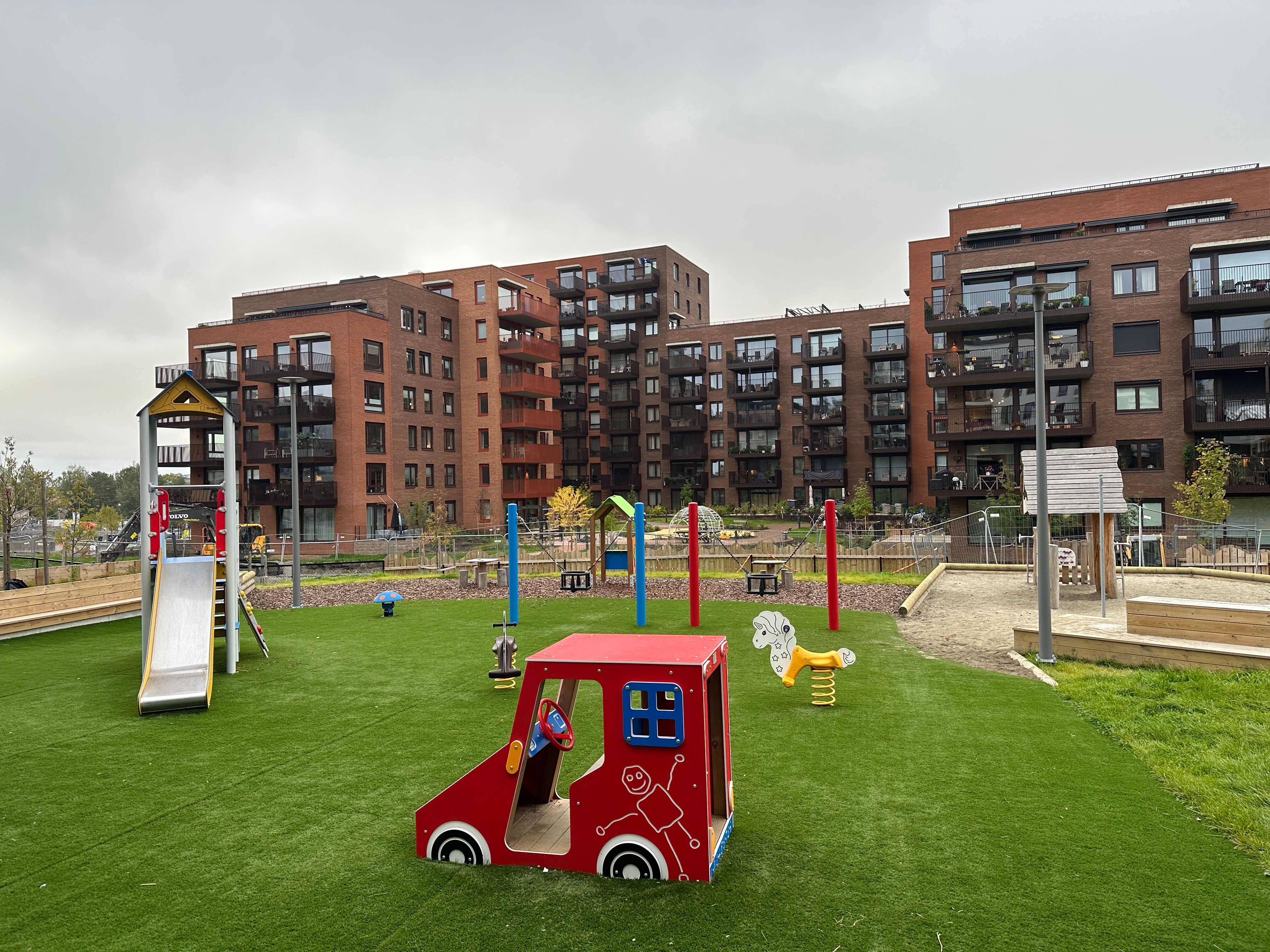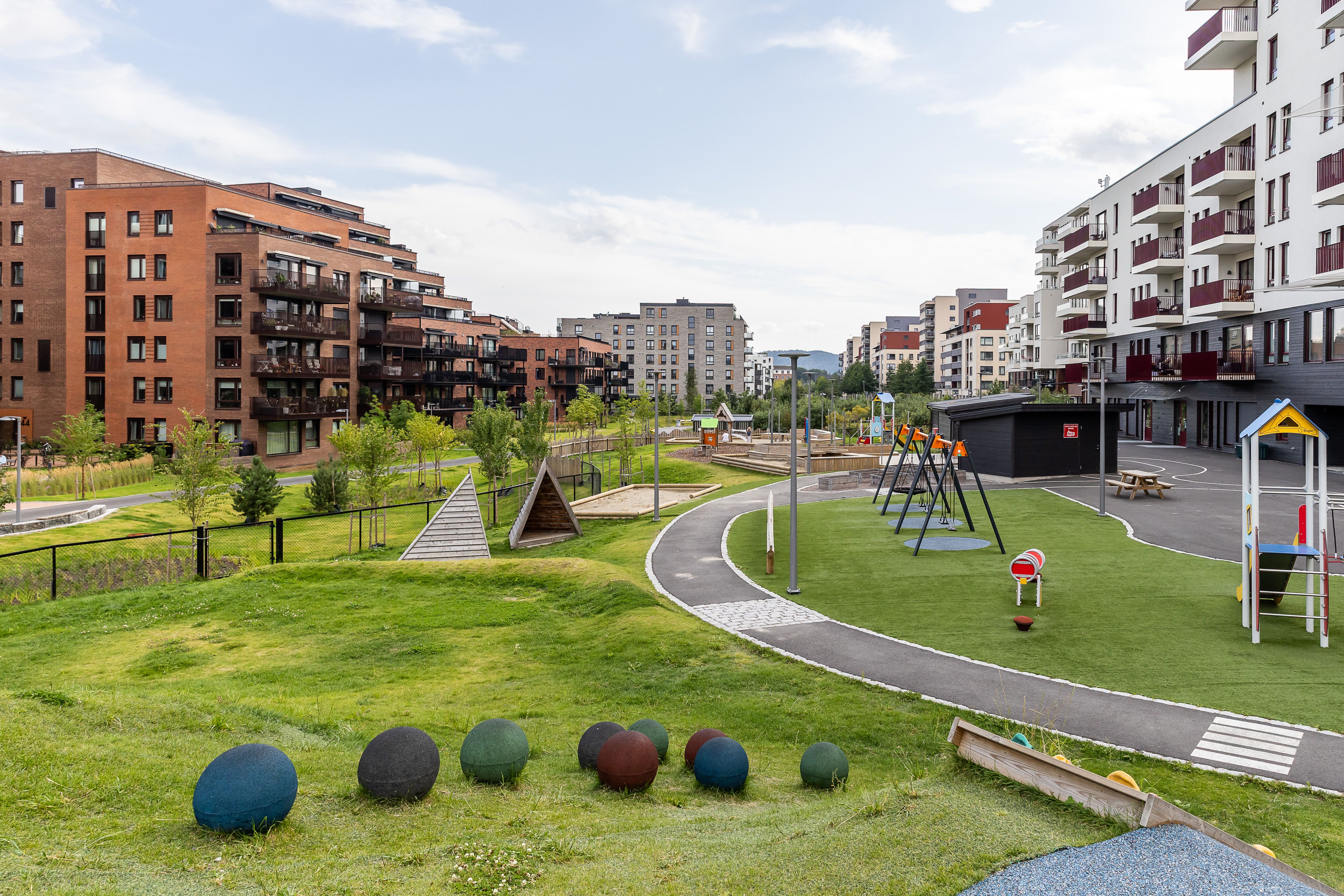 Uteområdene tilbyr et variert utvalg lekesoner med både lekeapparater og områder spesielt tilrettelagt for naturlek. Barnehagen har bærbusker, dyrkingskasser og en ramme av robust vegetasjon som integrerer uteområdet harmonisk med den tilgrensende parken. Blant lekemulighetene finner man et utekjøkken, en tipi og en gapahuk, i tillegg til mer tradisjonelle lekeapparater. De nærliggende omgivelsene byr på flotte turmuligheter, et lite skogsområde, ballbaner og tilgang til bibliotek.