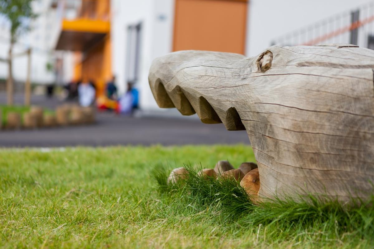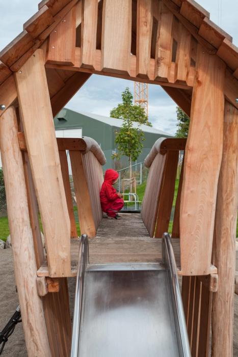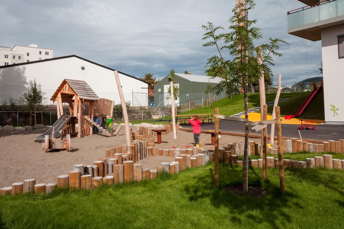 Lekeutstyret er i stor grad av heltre med nøytrale farger på konstruksjonene. Kantene er bygget av grove materialer som heltretre og kampesteiner, som gir en naturlik følelse og inviterer til lek med løse materialer.
