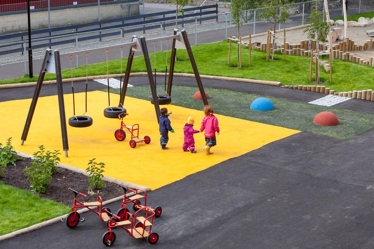Tomten er i utgangspunktet et flatt rektangel og det er jobbet med å skape brudd og ulike stemninger på tvers. Flatene deles i ulike soner med gummidekke i rolige farger, gress, asfalt, gressarmering og sand.
