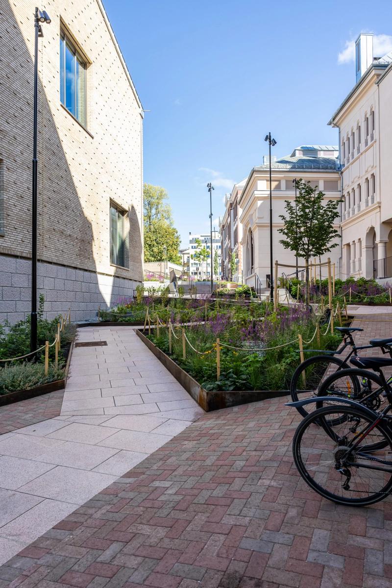 Bevisst bruk og ombruk av materialer, blant annet naturstein, gir kontinuitet og høy materialkvalitet. Valgene er gjennomtenkte og tilpasset det kulturhistoriske miljøet. Uteområdet er bilfritt og universelt tilgjengelig, med naturlige materialer som understøtter både bærekraft og stedets karakter.