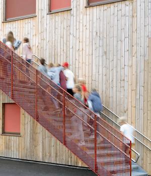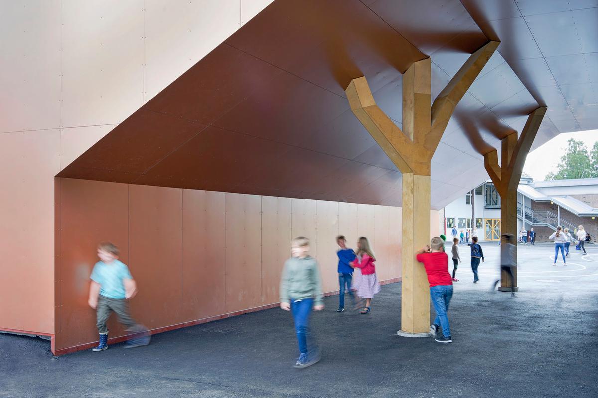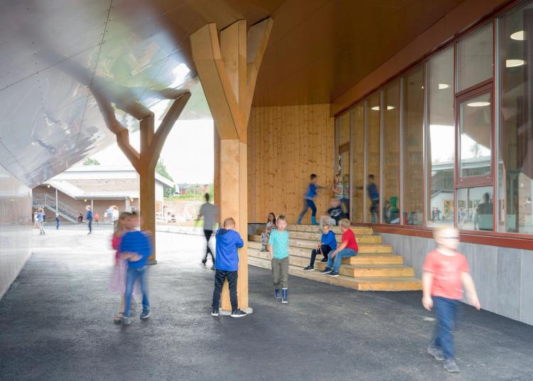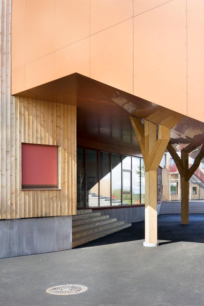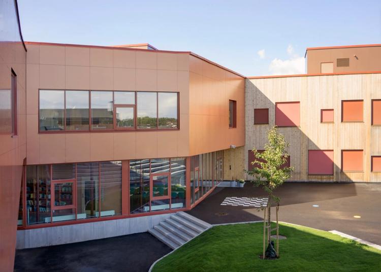 Et skolebygg i lyst treverk og oransje veggplater. Bygget har geometriske former og store vindusflater.