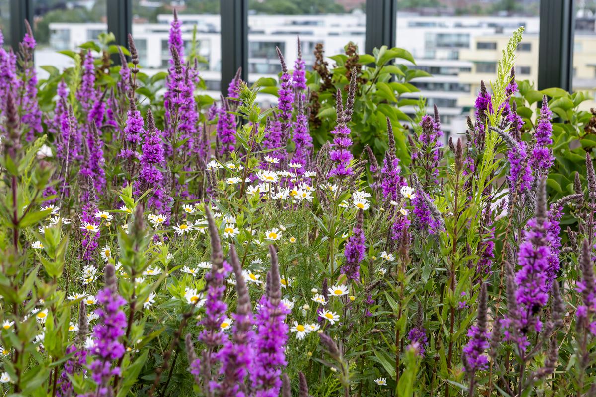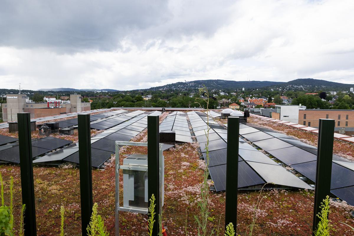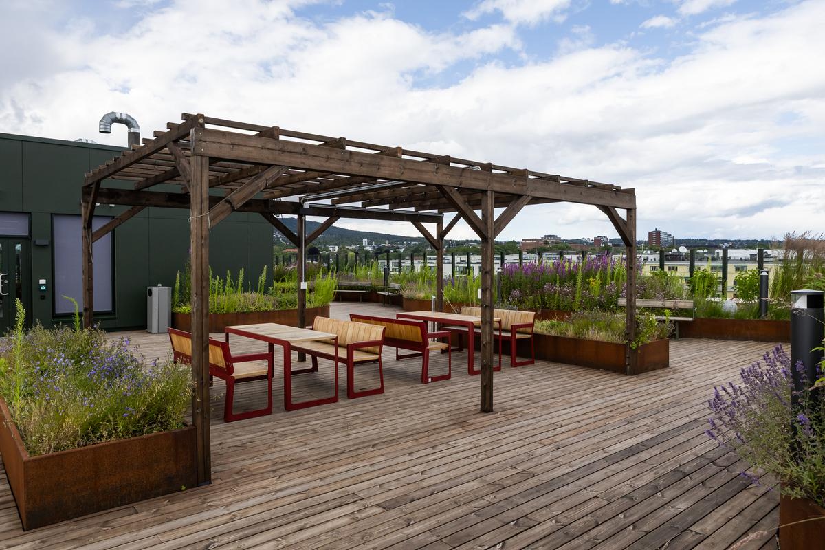 Sansehagen i bakgården danner et beskyttet, grønt rom hvor beboere og besøkende kan finne ro, oppleve natur og samvær. Takhagen viderefører disse kvalitetene, men med et åpnere uttrykk og utsyn over byen – en hage på himmelen med sitteplasser, sol, vann og blomstereng mellom solcellefeltene.