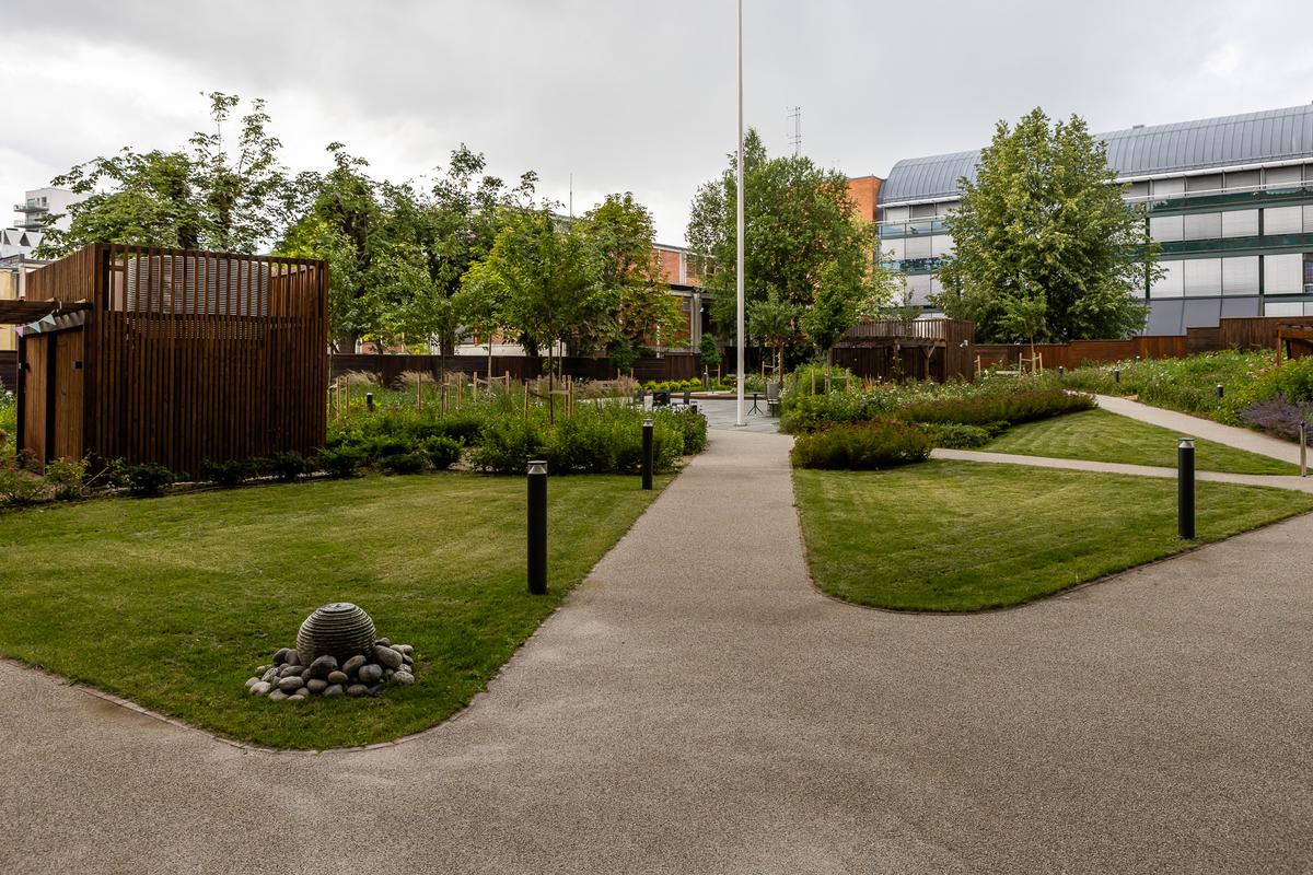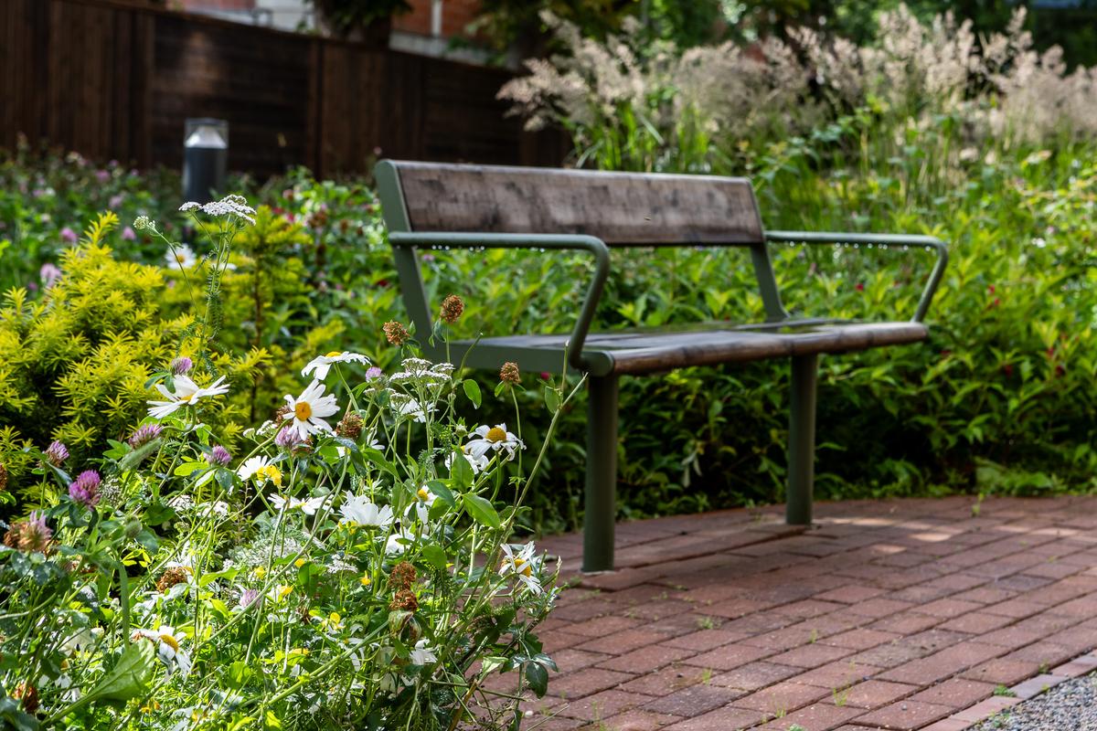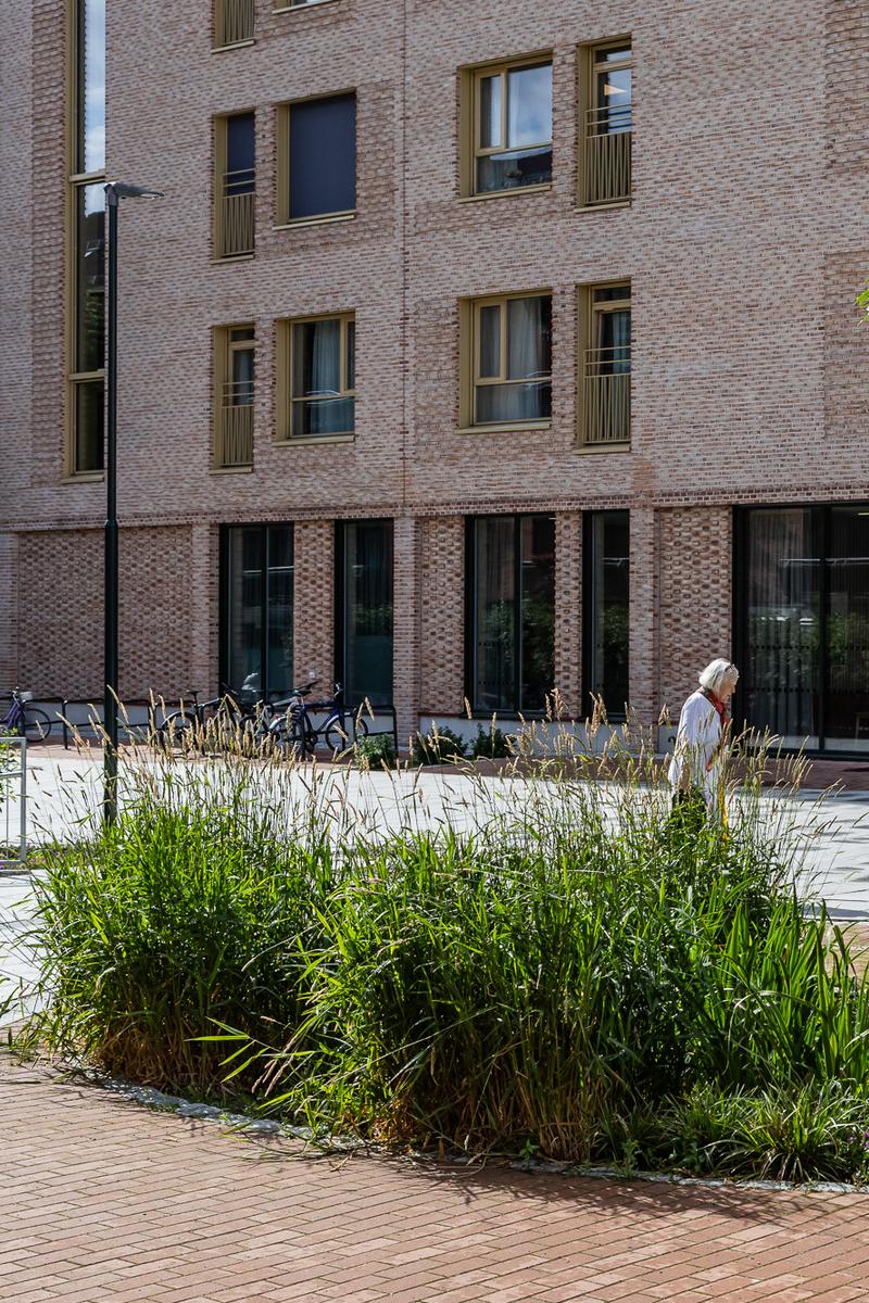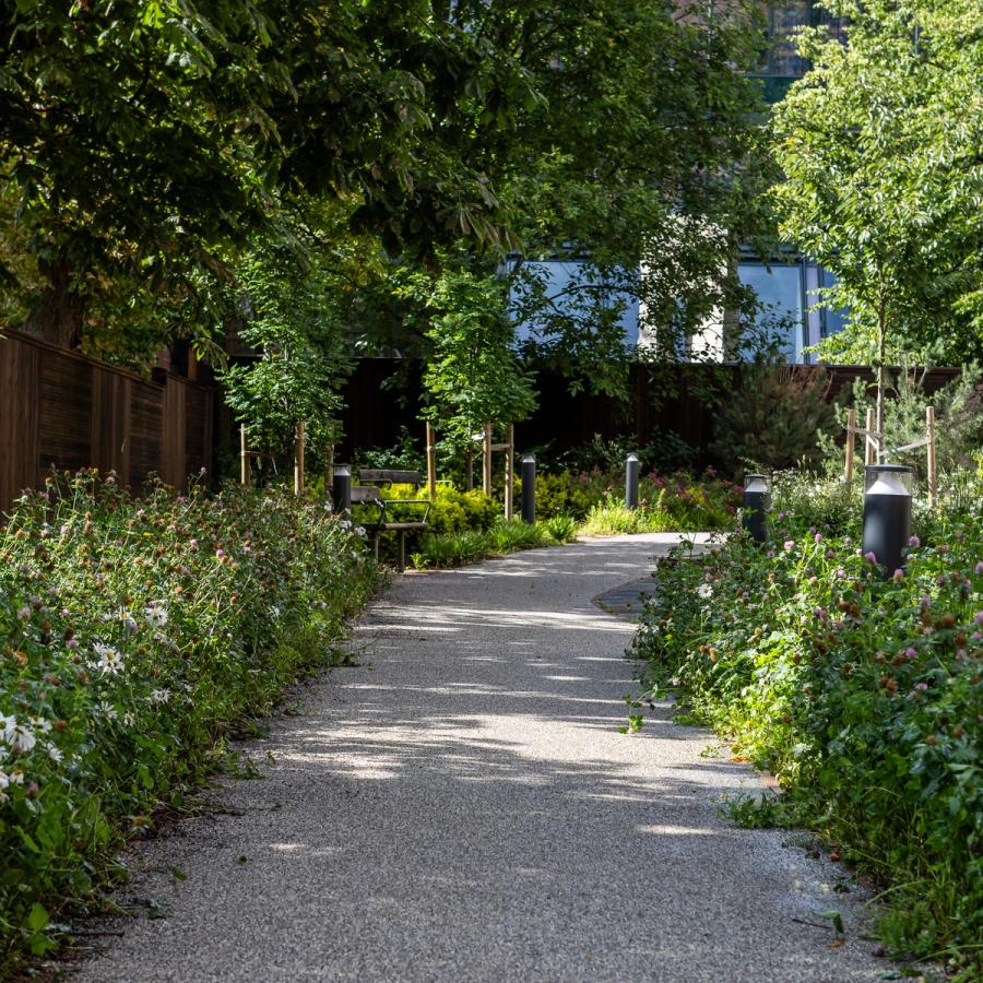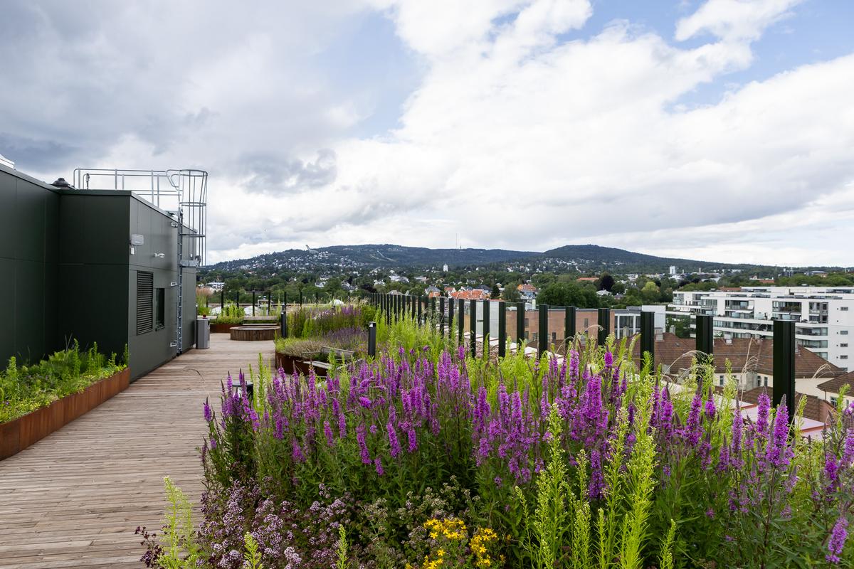 Prosjektet er sertifisert etter BREEAM-NOR Excellent, og legger vekt på gjenbruk av materialer, åpen overvannshåndtering og bevaring av eksisterende trær. Resultatet er et robust og lettstelt anlegg som oppleves frodig, variert og hjemlig – og som inviterer både beboere, ansatte og naboer til å bruke uteområdene aktivt gjennom året.