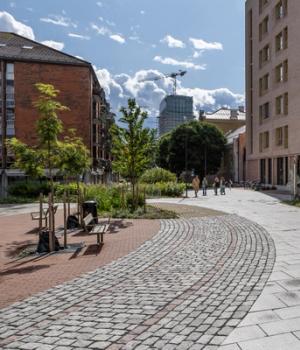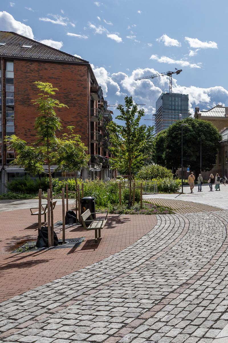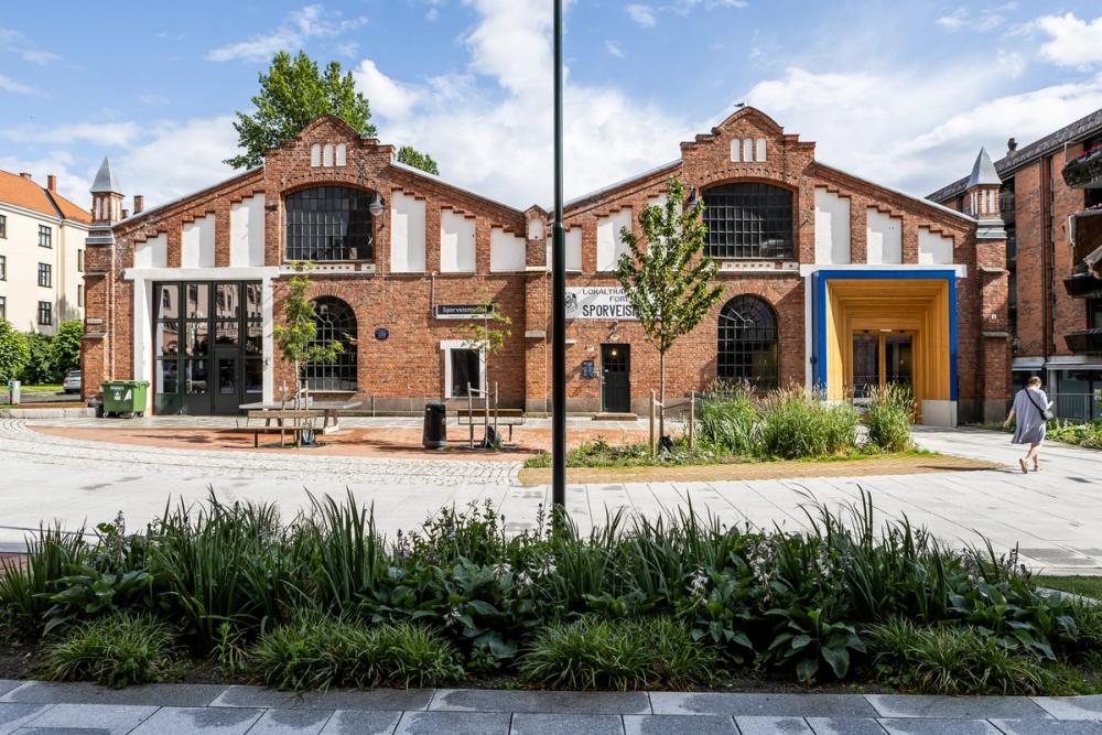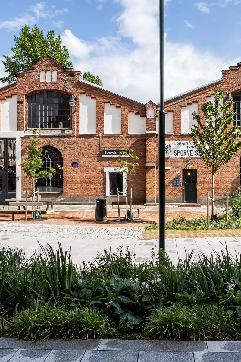 Mellom sykehjemmet og Sporveismuseet åpner det nye torget seg som et inviterende møtepunkt for nabolaget. Her er beplantningen variert og årstidsrik, med trær, stauder og regnbed som både håndterer overvann og skaper et levende byrom. I belegget er de gamle trikkesporene markert som et minne om stedets historie, og bidrar til å gi torget en tydelig identitet og en naturlig sammenheng med Sporveismuseet.