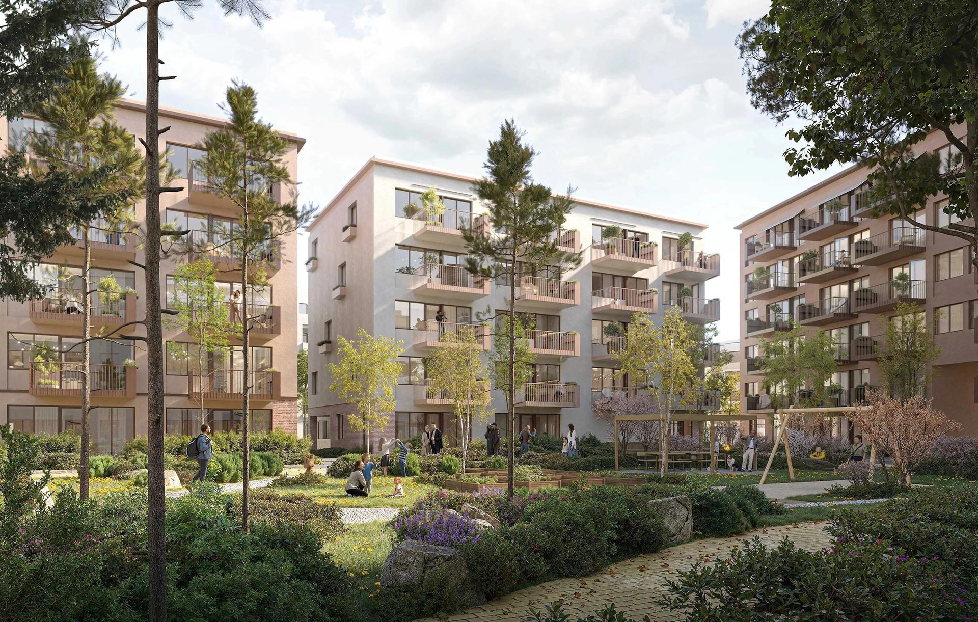 To nye boligprosjekter på Mortensrud. De nye boligfeltene har tilgrensende naturområder med spennende barblandingsskog, og det er en intensjon og trekke naturen inn i de nye uteområdene på tunet og i gårdsrommet.
