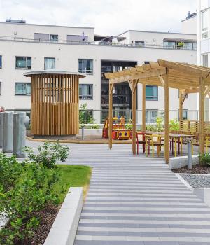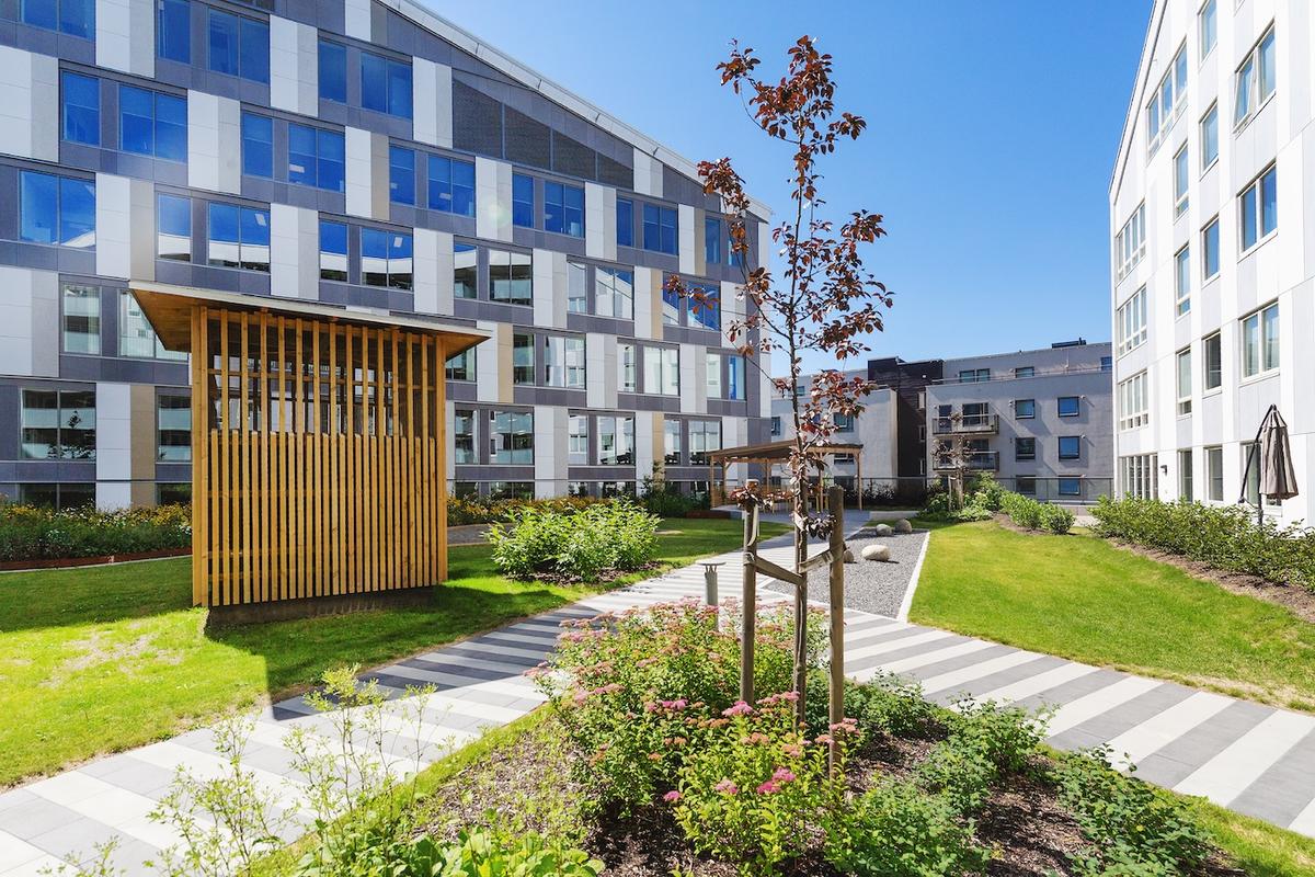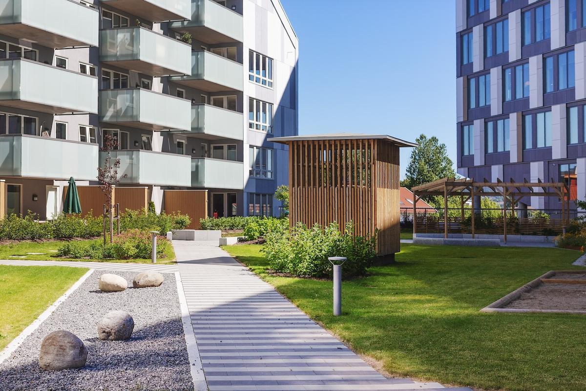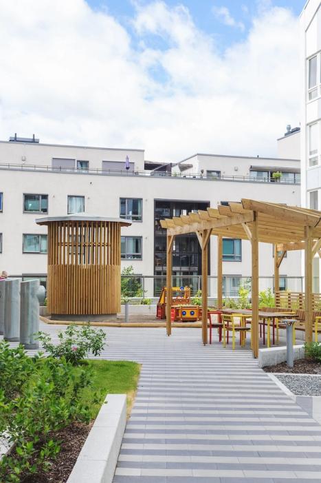 Gårdsrommene har fått en variasjon i muligheter, med små og større møteplasser, lekeplasser og gode ganglinjer. Gårdsrommene er utsikten til mange leiligheter og har fått en spennende grafikk og variasjon i planter og trær som bidrar til en interessant utsikt.