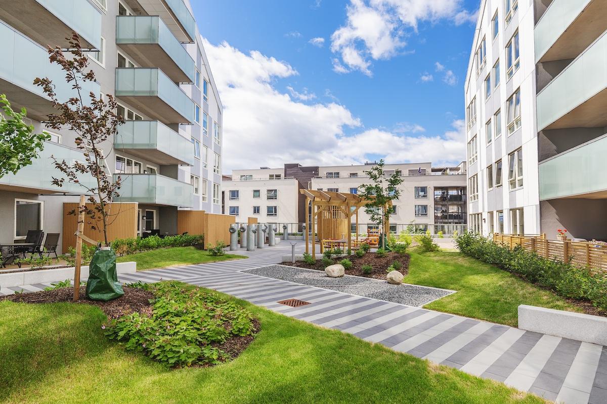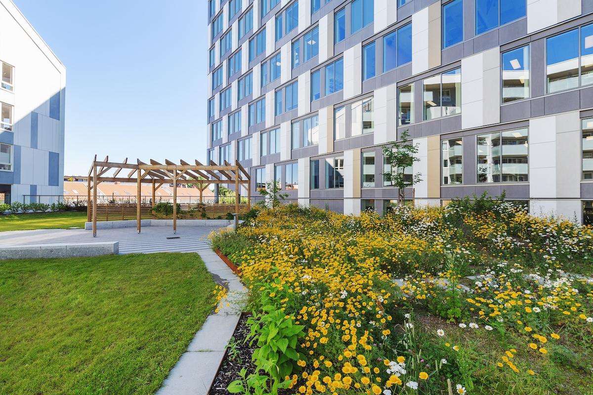 En etasje over bakken ligger to skjermede gårdsrom for boligdelen av prosjektet Portalen. Her er det bygget intime uterom som bare er åpne for beboere.