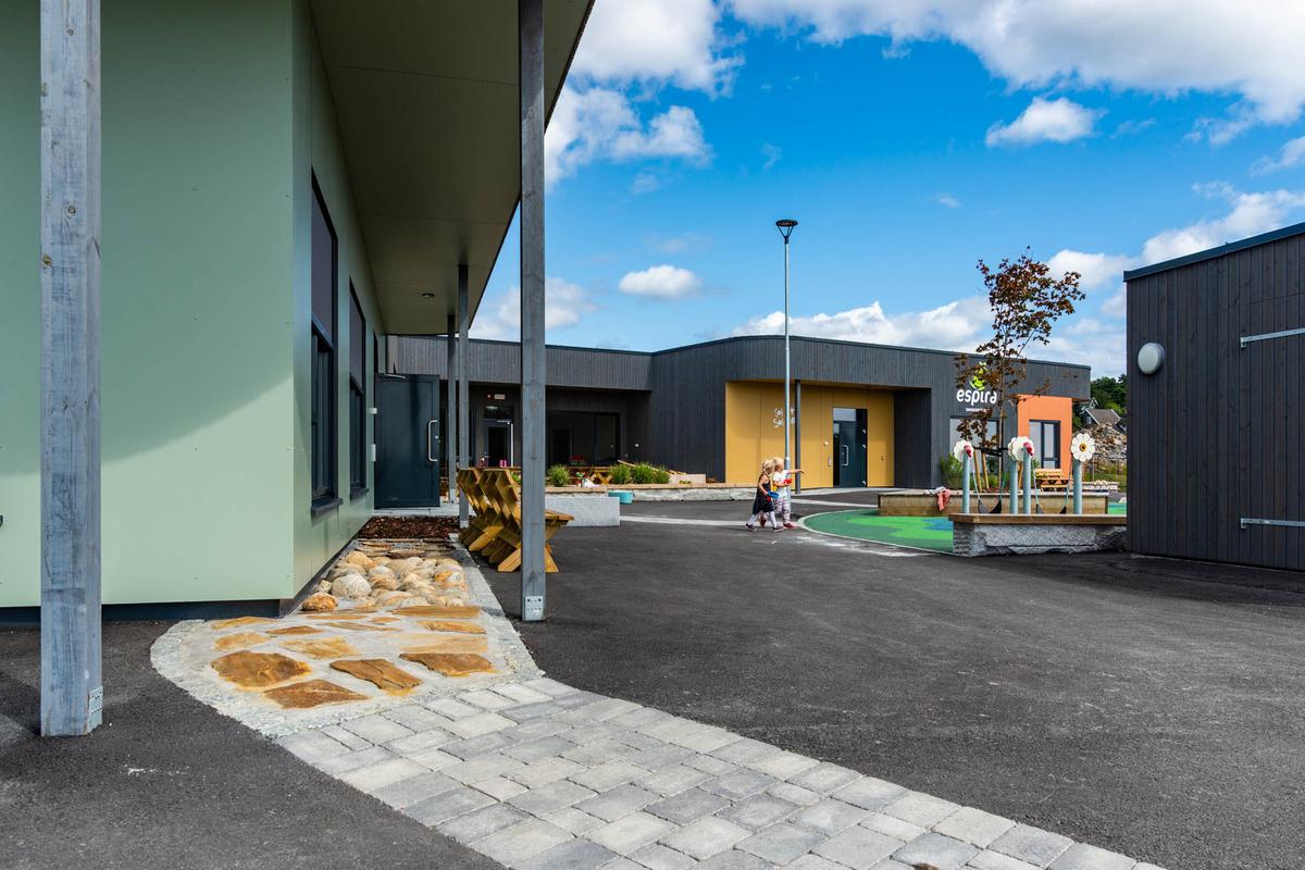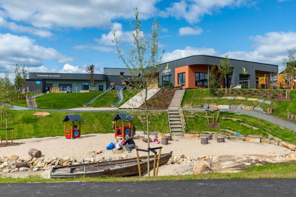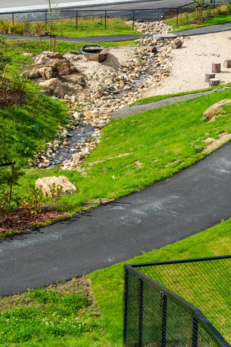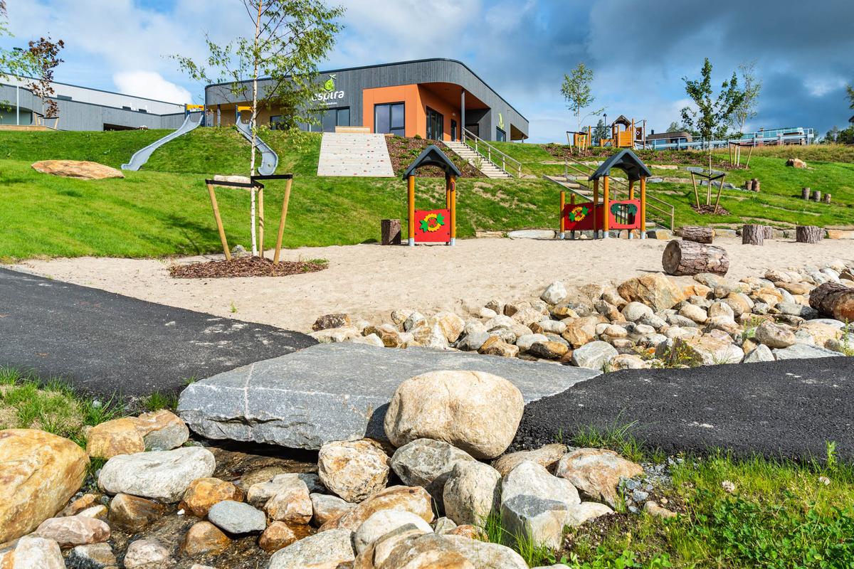Uteområdet er delt inn i ulike soner, slik at både de minste og de eldre barna finner rom for både rolig og aktiv lek, tilpasset deres behov.