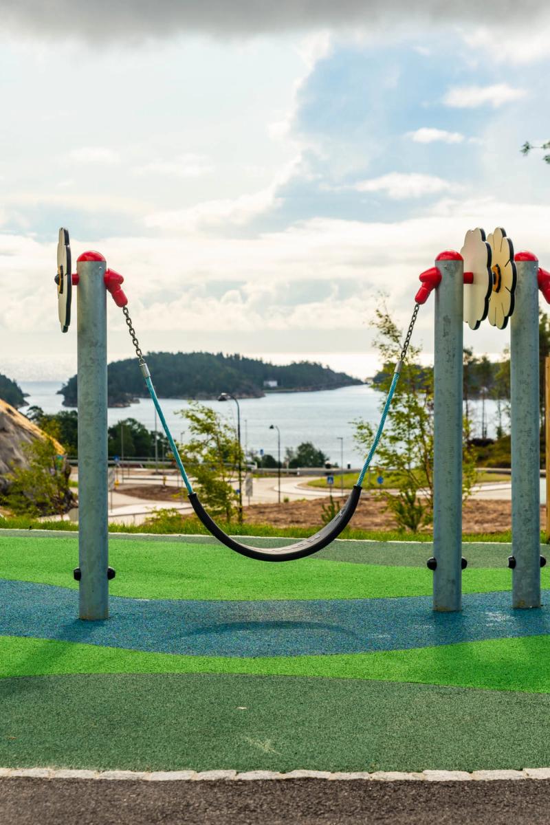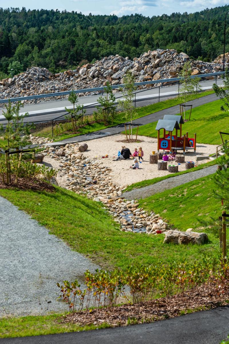 Terrengforskjeller, fjelltomta, gresskledde bakker og bevarte steiner og stubber gir ulike muligheter for å utfordre egne ferdigheter, utforske spennende kriker og kroker, og øve på motoriske ferdigheter. Gapahuken i enden av tomta fungerer som et nært turmål, med mulighet for bål og felles matopplevelser for alle aldersgrupper.