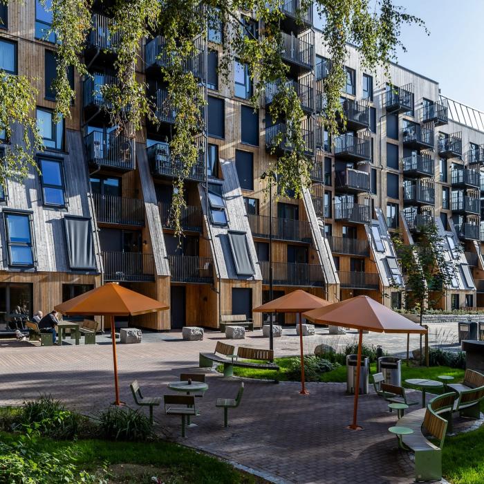 Bygningsmassen har gjennomgått en omfattende rehabilitering med blant annet høyisolerende fasader i behandlet treverk, nye ventilasjonsløsninger og solcellepaneler på tak og gavlvegg. Samlet bidrar tiltakene til å redusere energiforbruket med over 70 prosent. Oppgradert belysning ved oppgangene og i passasjen til Markveien bidrar til trygghet og trivsel i området.