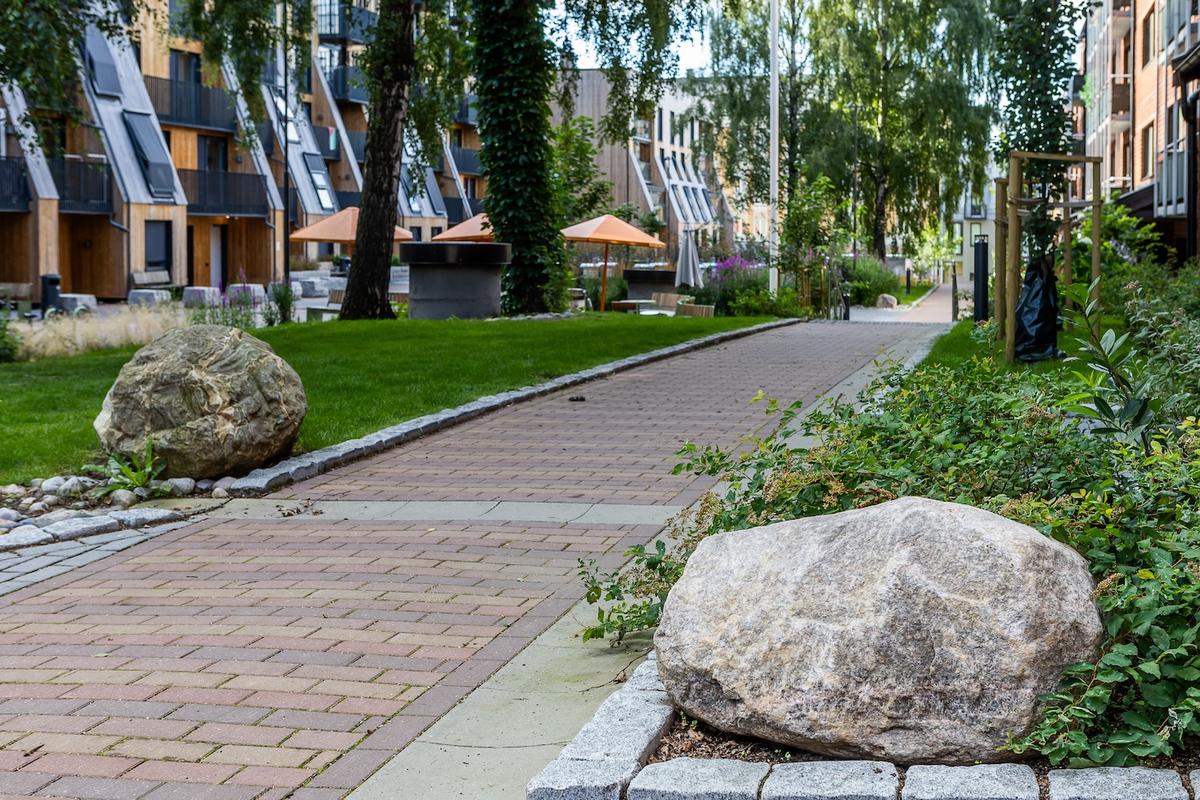 Gårdsrommet har et hellende terreng i nord-sør-retning, hvor beboerne tidligere har hatt vannproblematikk mot kjelleren og oppstuving av vann på overflaten. Med terrengforming og åpen overvannshåndtering, styres vannet til de større grøntarealene i gårdsrommet via regnbed og renner. Ved å ta vare på de større eksisterende trærne og å plante nye trær, bruke beplanting for å skille mellom private og felles arealer inviteres beboere og besøkende inn til et grønt og frodig gårdsrom.