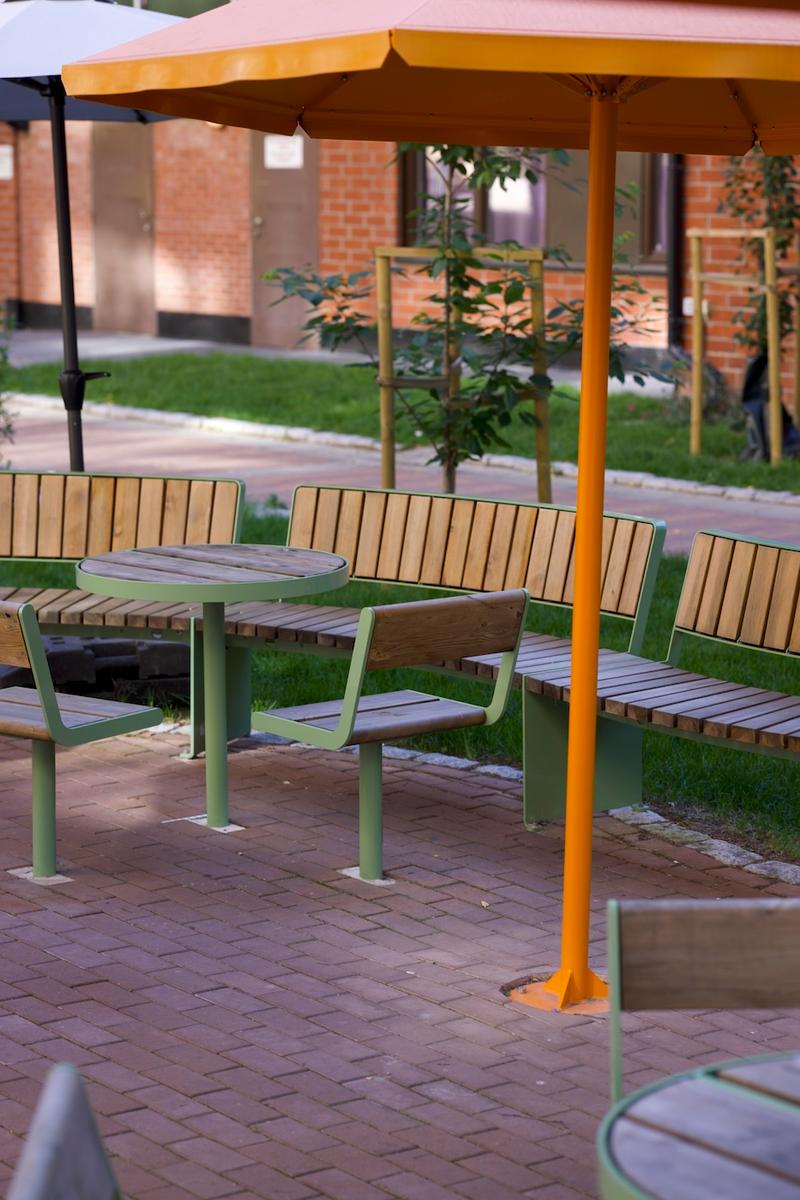 Bakgården ligger sentralt på Grünerløkka, og blir brukt som en «snarvei» for andre som ferdes i området. Det var viktig å få til tydelige soner for hva som er privat og hva som er felles. Den «røde løperen» indikerer raskeste vei gjennom, og de alternative slyngete ganglinjene inviterer inn til de sosiale sonene med langbord, parasoller, griller og sittekanter. En fargepallett med varme farger som passer til eksisterende teglfasade og de nye rehabiliterte fasadene i treverk er brukt i belegg, møblement og utstyr.