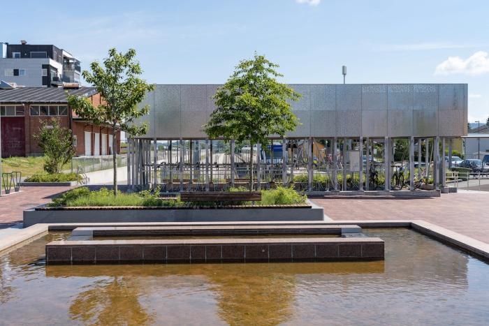 Bytorget har plass til markedsboder og fine sitteplasser med utsikt til vannspeilet med sildrende vann. Regnbed med frodig vegetasjon avgrenser torget og ivaretar overvannshåndteringen.