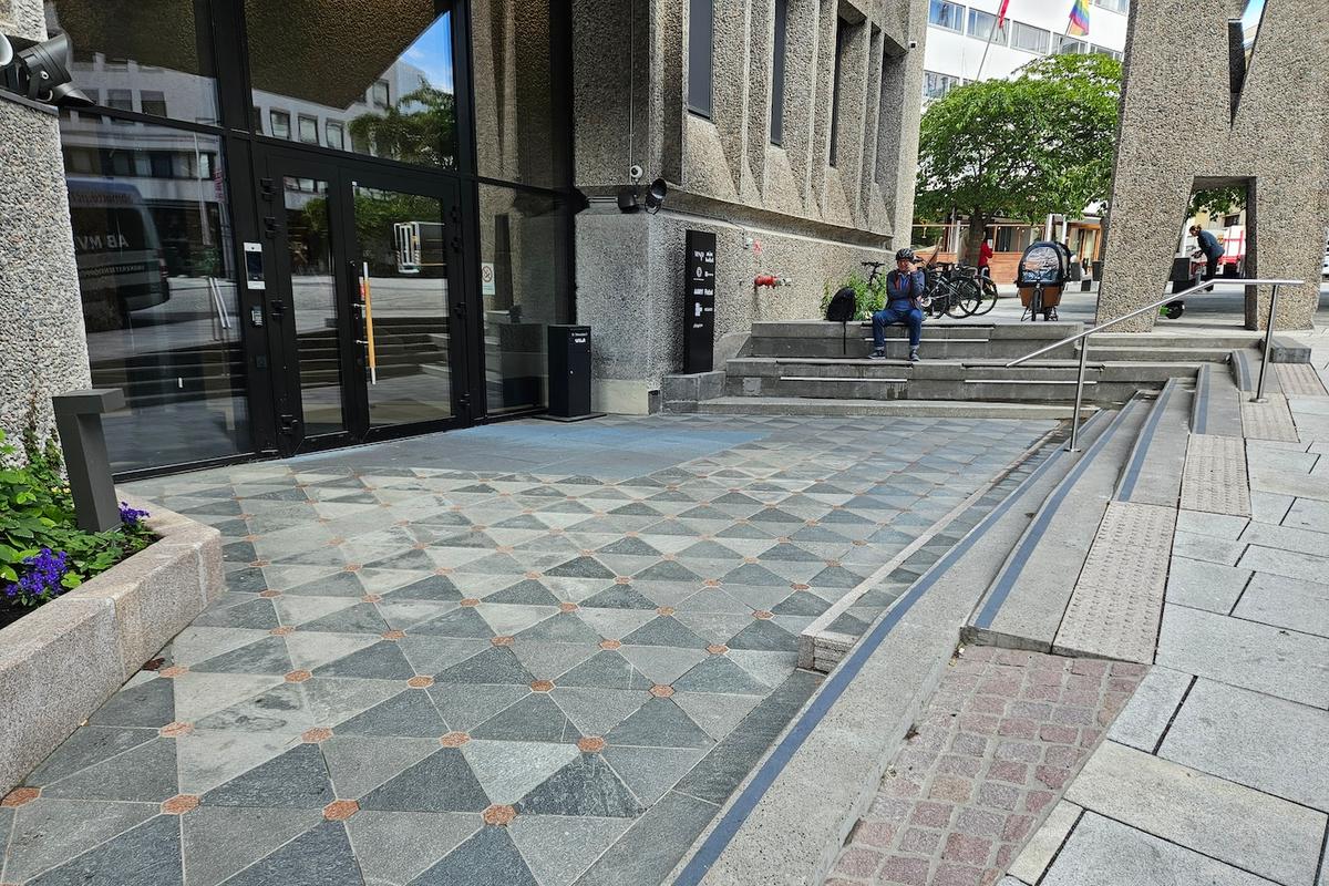 Gangsonene har fått nye granittdekker, frodige plantefelt, sitteplasser og sykkelparkering. Deler av utskåret naturbetongfasade er gjenbrukt som benker i uteanlegget med vakker kontrast mellom de ulike overflatene.