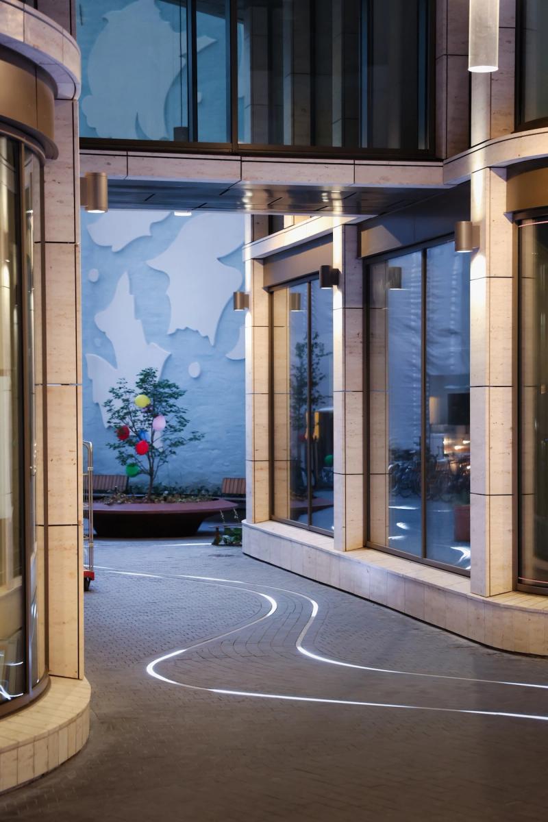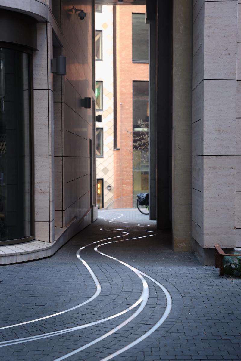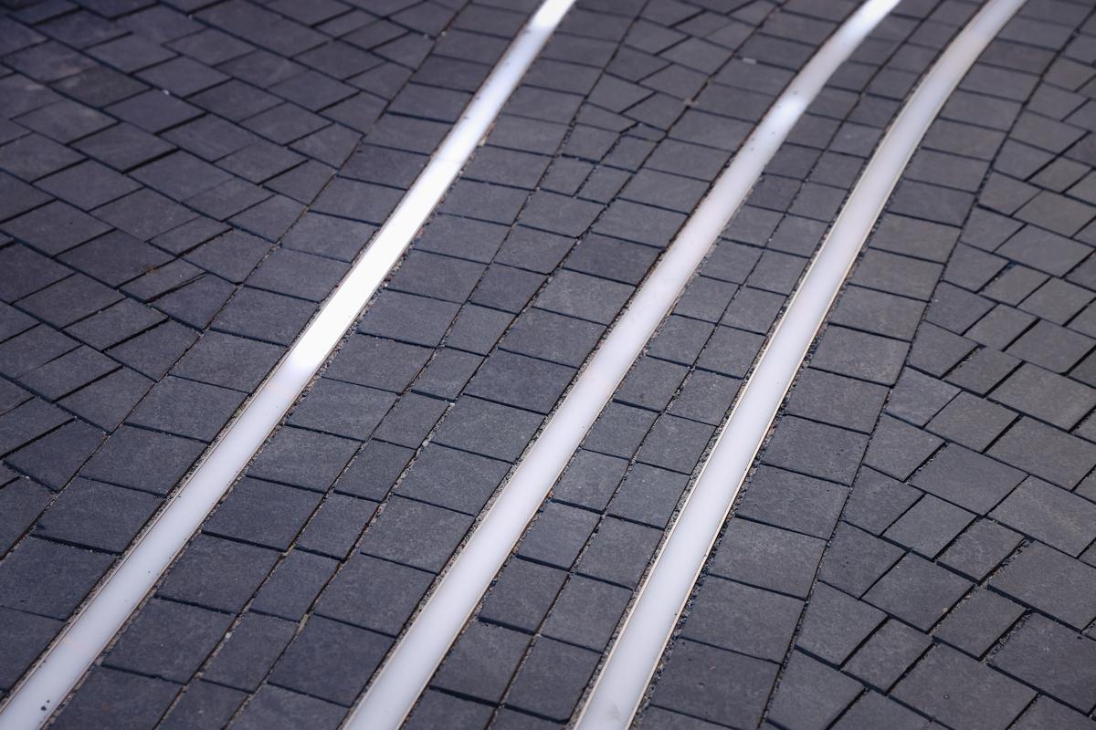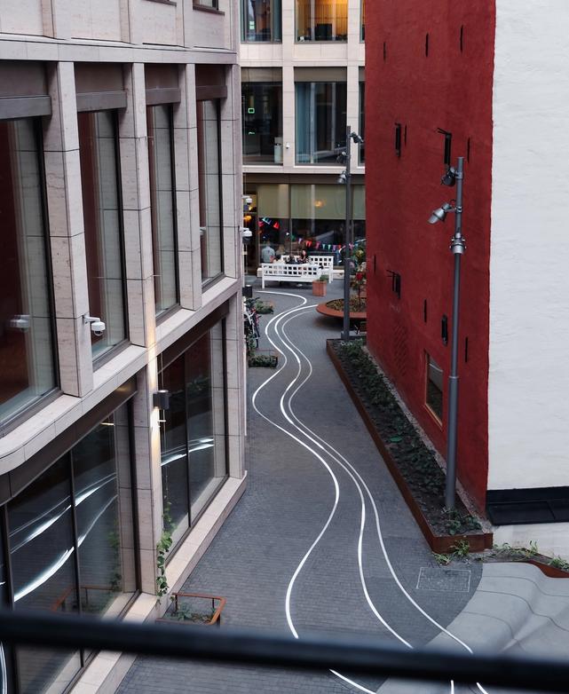 Et helhetlig belegg av mørk basalt med integrert lys danner et sammenhengende bygulv. Som et elveløp leder lyset inn til og gjennom kvartalet og skaper en spennende stemning i uterommene. Lysslyngene passerer et amfi utformet som et svaberg. Dette mykt trappede amfiet i mørk betong er populært for opphold og samling.