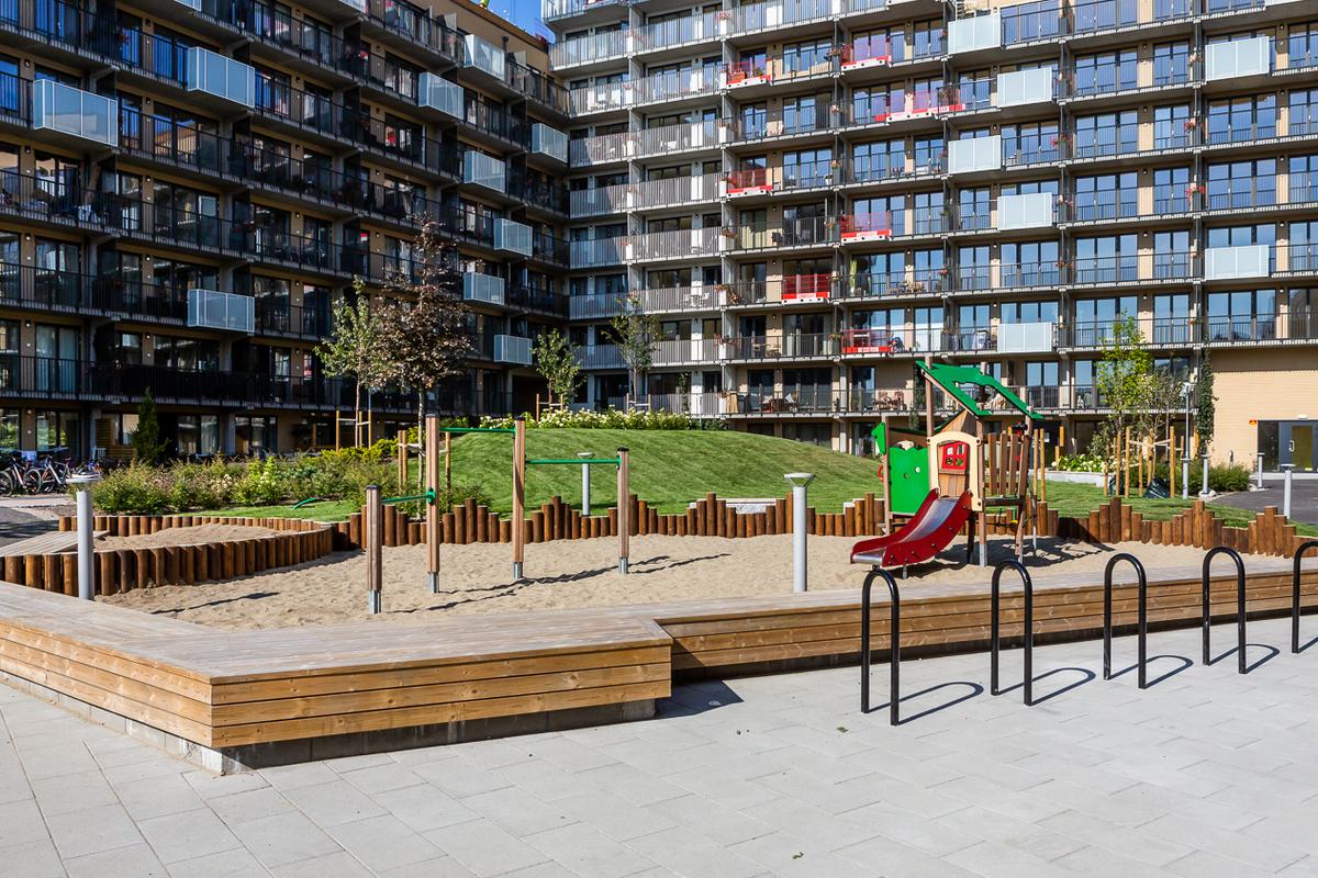 Gårdsrommet vender ut mot den nye parken, som også tegnes av LANDSKAPERIET. Gårdsrommet får mange flotte kvaliteter med store grøntområder, barnehage og felles uteplasser.